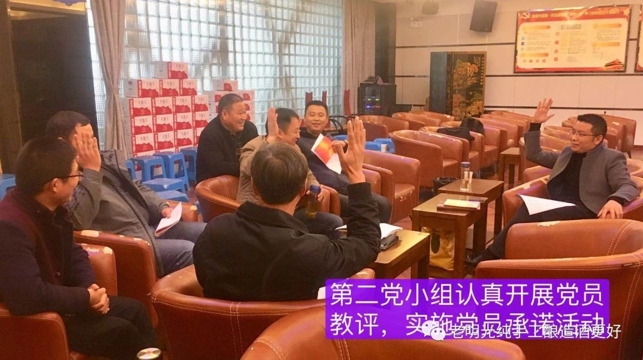 公司紀委書記閆興淮、銷售公司總經理劉邦先后發布重要講話:指出:2018年我們黨支部整體工作完成的很好。尤其是圍繞市場和銷售作了大量有效的工作。黨員教評及簽署黨員承諾書很重要,要求黨員按照自己承諾的內容,時刻對標,嚴格要求自己,做到表里如一,落實在具體工作中。尤其是川酒進軍全國市場的當下,白酒市場將面臨重大變革。要求明酒銷售公司全體黨員干部要“練內功、比業績、做貢獻”,黨員要發揮引領作用和黨員先鋒模范作用。要求陳言軍,在思想上先入黨,立足新起點,更加嚴格要求自己,在市場激烈的競爭中,做出驕人的業績,不負組織的培養和全體黨員的信任。