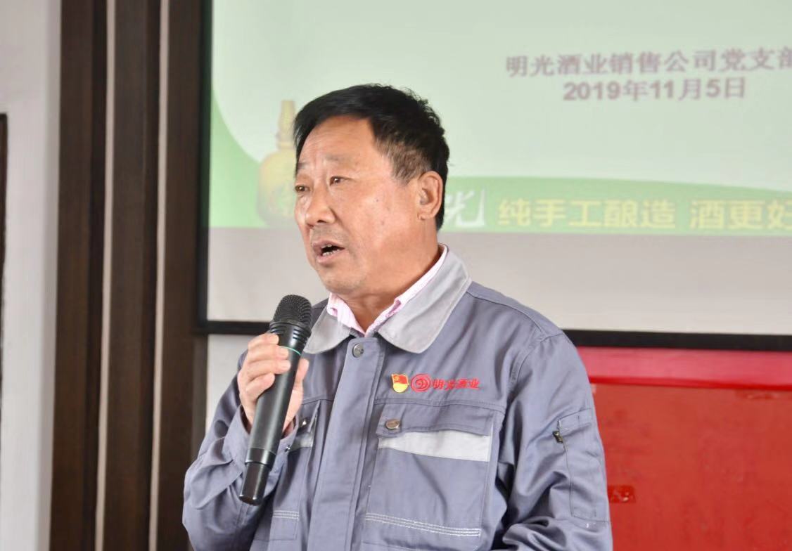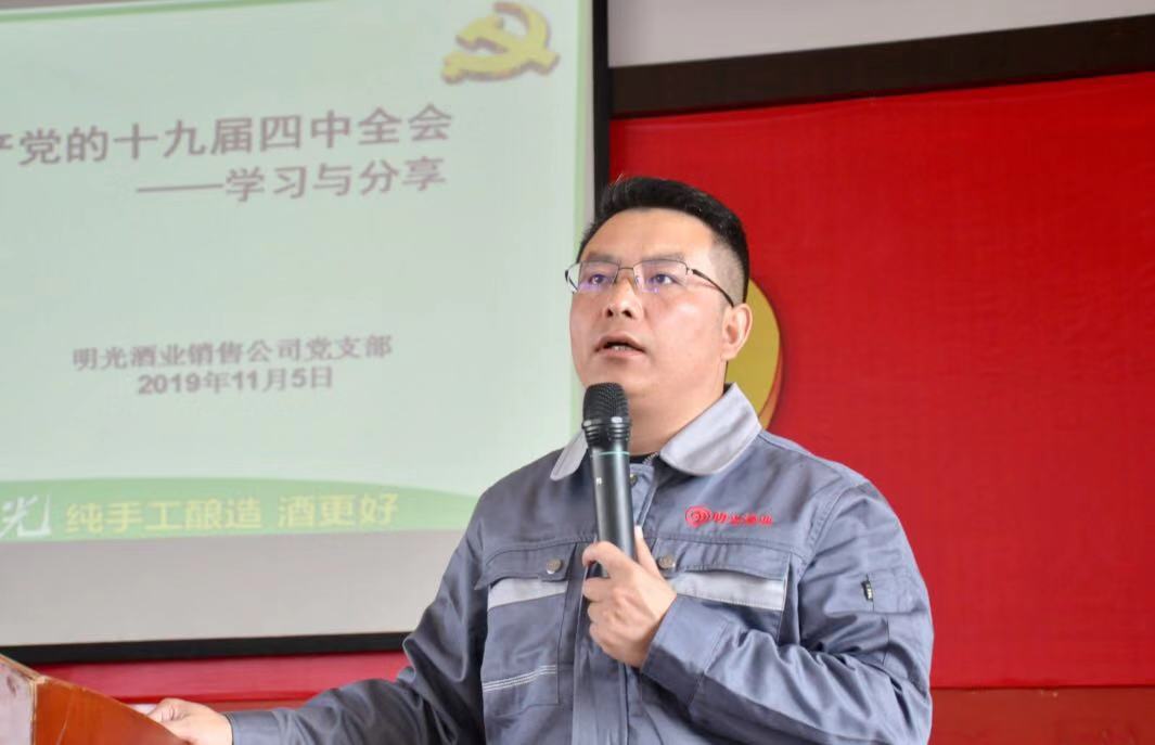 11月5日,明光酒業(yè)第一黨支部在公司五樓會(huì)議室召開(kāi)“不忘初心、牢記使命”主題教育研討暨學(xué)習(xí)貫穿十九屆四中全會(huì)黨員干部大會(huì)。銷售公司、監(jiān)察部、品牌推廣部全體黨員及銷售主管、行政副科以上干部50余人參加大會(huì)。大會(huì)由黨支部書(shū)記錢(qián)軍主持。