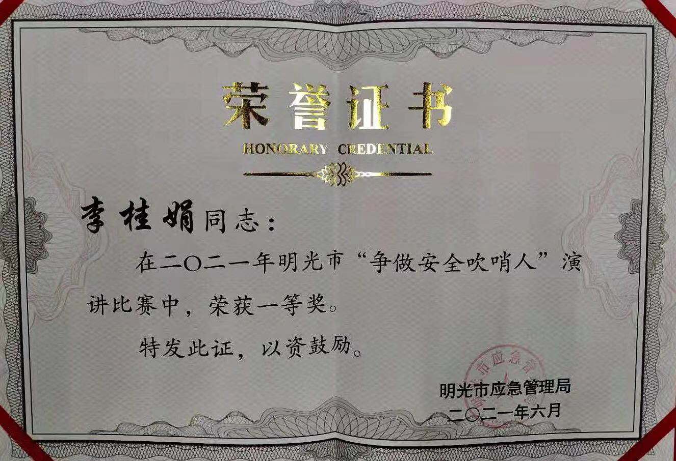 6月9日,明光酒業李桂娟同志參加“安全生產月”期間明光市“爭做安全吹哨人”企業職工主題演講比賽,喜摘全市“一等獎”桂冠。