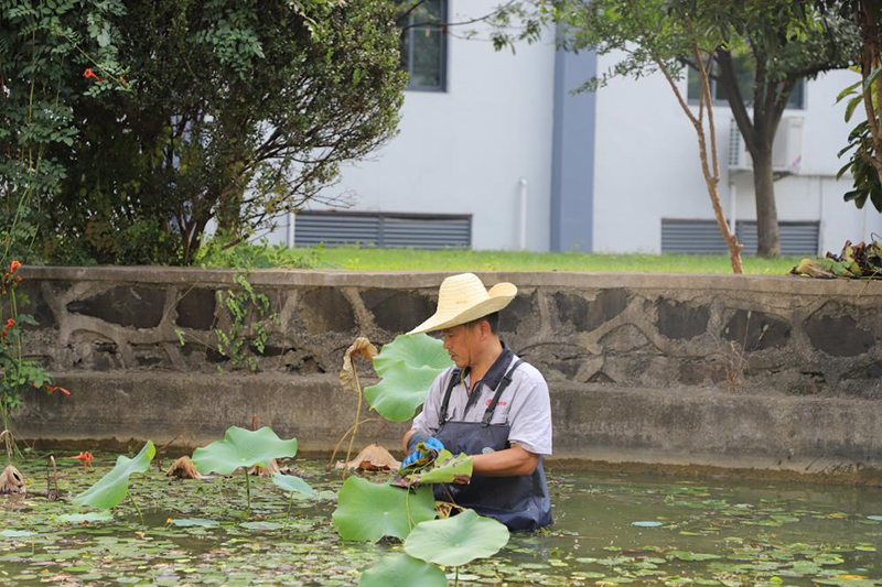 頭頂上是不知長了多少年的大樹,樹冠闊大,有一種幽深的線條之美。對欒軍來說,和花草樹木打了16年的交道完全是人生預料之外的事。1987年剛進廠那會兒欒軍是釀酒工,2005年被分到行政部后勤科,打理廠區綠化成了他每天的“必修課”。剛開始他以為這就是個考驗體力的活,真正上手后,感覺卻截然不同。“看到自己打理的一朵朵花綻放,自己栽下的一棵棵樹苗抽芽,讓人感到非常有成就感,就想盡力把這些花草照顧好”,欒軍回憶剛剛接觸苗木時說道。經過十六年的磨煉,現在的他已經把植物的脾性摸得一清二楚。樹早上要開始喝水,所以欒軍每天很早出門,當大家走進廠區的時候,很多樹已經精神十足的伸展枝葉了。