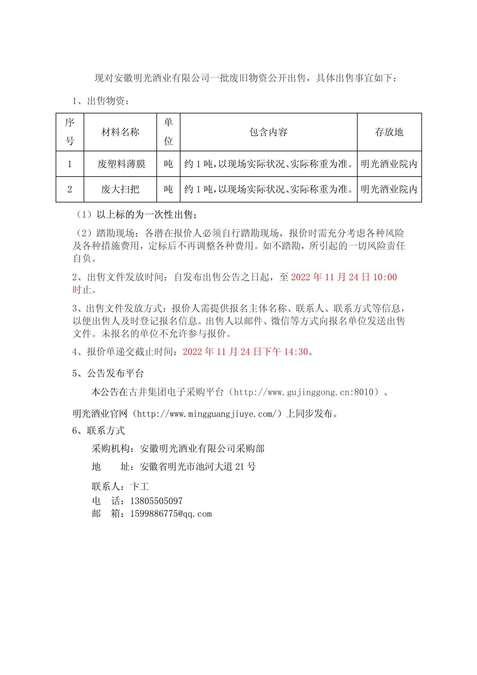 明光酒業廢舊物資出售公告