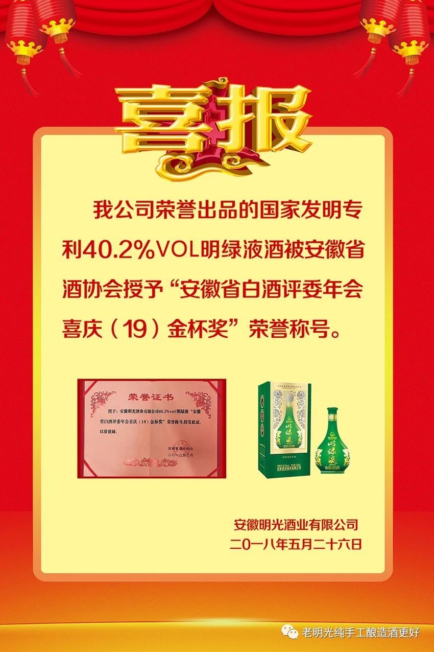 喜報:我公司榮譽出品的國家發明專利40.2%vol明綠液酒被安徽省酒協會授予“安徽省白酒評委年會喜慶(19)金杯獎”榮譽稱號。
