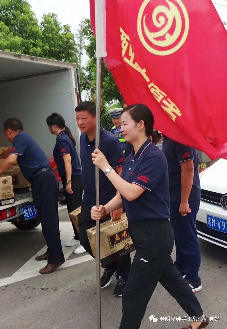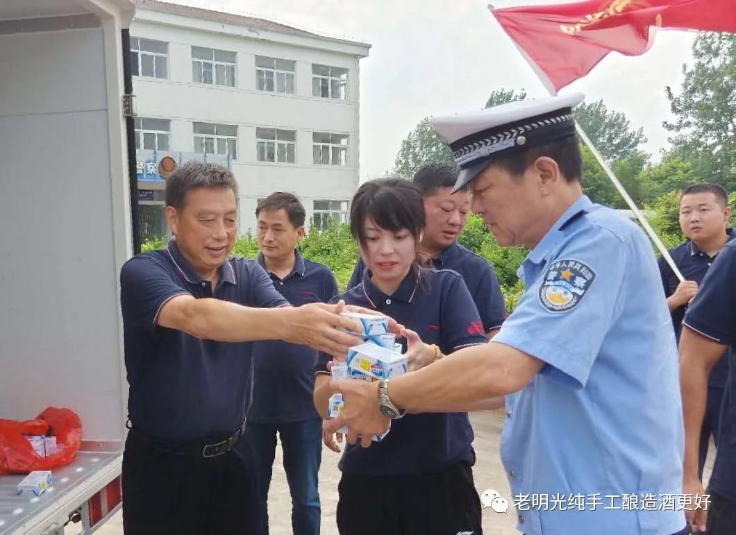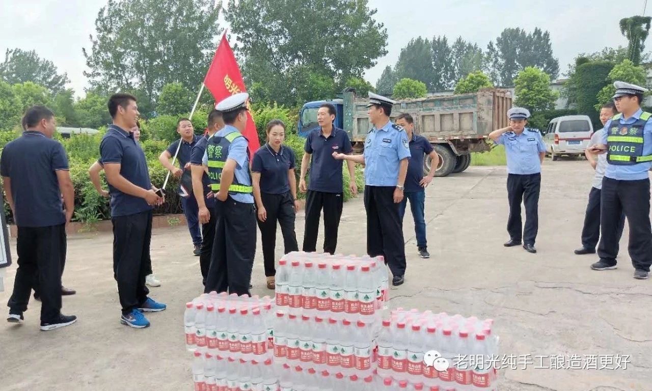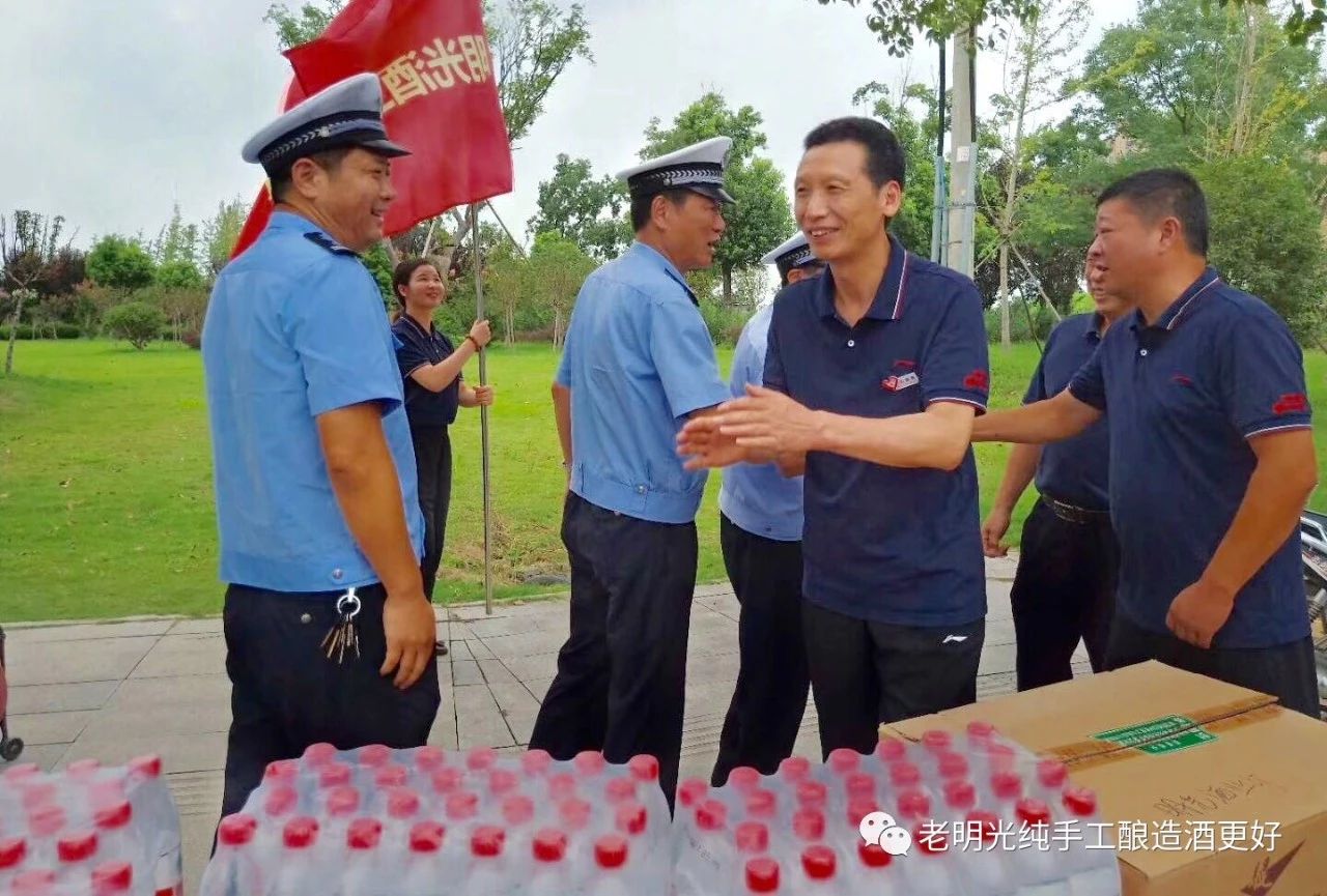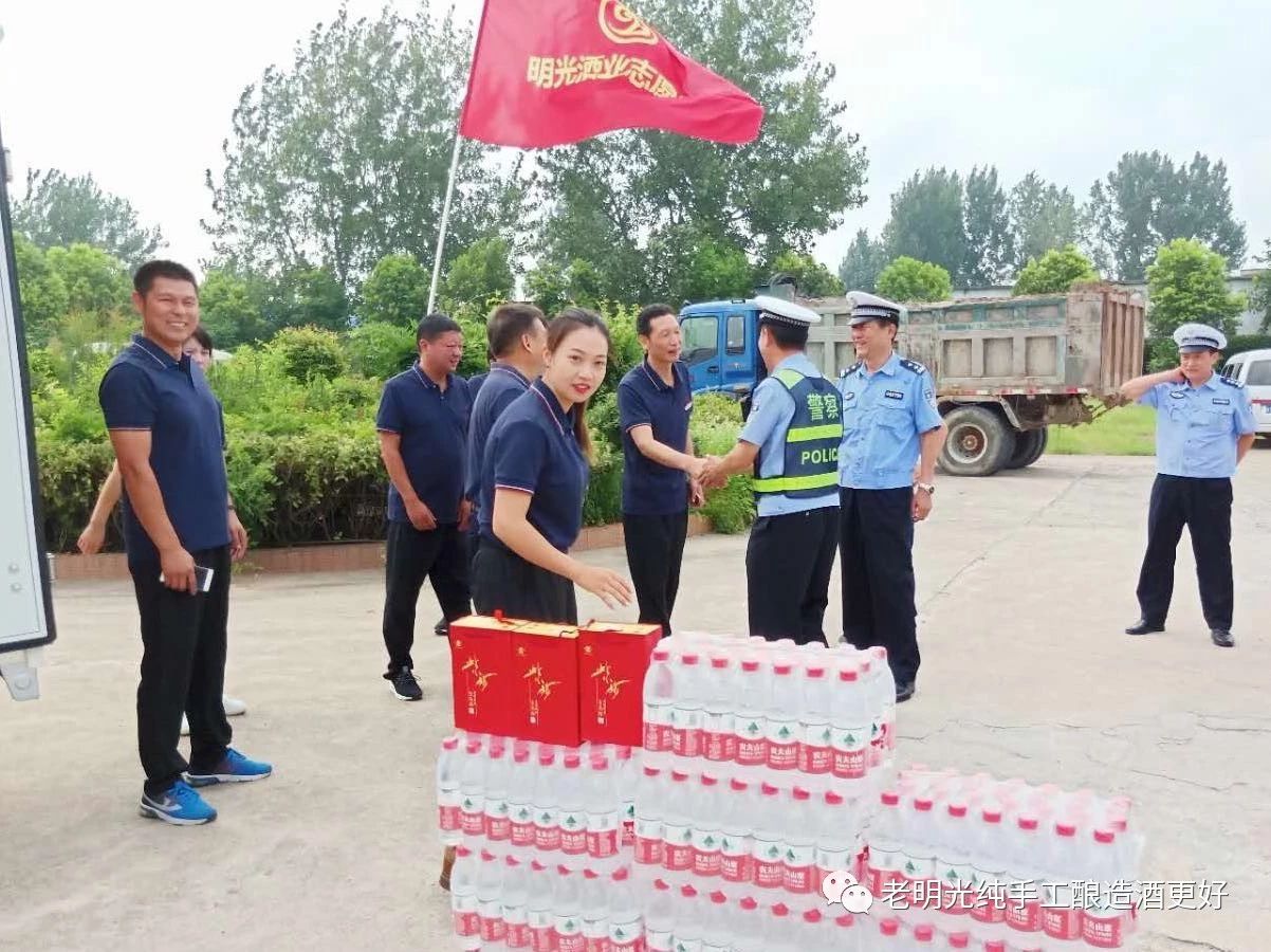 2018年8月3日,安徽明光酒業(yè)有限公司工會主席趙玉龍,銷售公司總經(jīng)理助理劉楚攜明光區(qū)域經(jīng)銷商代表一行,在明光市交警大隊王大隊長、許副大隊長引領(lǐng)下,驅(qū)車前往張八嶺、橋頭、澗溪等中隊,慰問烈日下的交通警察。