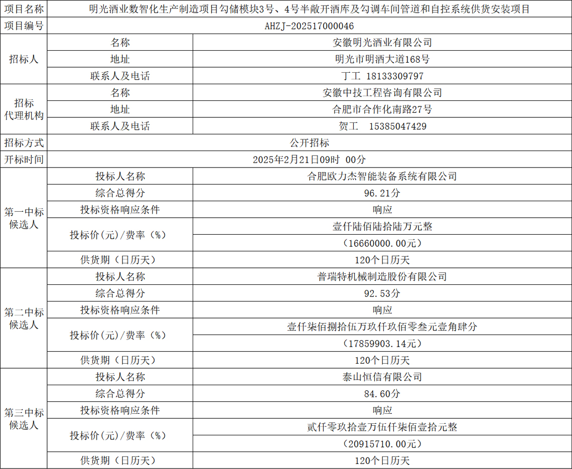 若投標(biāo)人或者其他利害關(guān)系人對(duì)上述結(jié)果有異議,可在公示期內(nèi)以書(shū)面形式,向招標(biāo)人或招標(biāo)代理機(jī)構(gòu)提出異議,材料遞交至安徽明光酒業(yè)有限公司或安徽中技工程咨詢有限公司,地址:明光市明酒大道168號(hào)或合肥市蜀山區(qū)合作化南路27號(hào),聯(lián)系人:丁工或賀工,聯(lián)系電話:18133309797或15385047429。 古井集團(tuán)紀(jì)委聯(lián)系方式:0558-5718060。 書(shū)面異議材料應(yīng)當(dāng)包括以下內(nèi)容: (1)異議人的名稱、地址、有效聯(lián)系方式; (2)項(xiàng)目名稱、項(xiàng)目編號(hào)、標(biāo)段號(hào)(如有); (3)被異議人名稱; (4)具體的異議事項(xiàng)、基本事實(shí)及必要的證明材料; (5)明確的請(qǐng)求及主張; (6)提起異議的日期。 (7)異議人為法人的,應(yīng)當(dāng)由法定代表人或授權(quán)代表簽字并加蓋公章;為其他組織或個(gè)人的,異議材料須由其主要負(fù)責(zé)人或者異議人本人簽字,并附有效身份證明復(fù)印件。 (8)異議人需要修改、補(bǔ)充異議材料的,應(yīng)當(dāng)在招標(biāo)人或招標(biāo)代理機(jī)構(gòu)規(guī)定的期限內(nèi)提交修改或補(bǔ)充材料。 有下列情形之一的,不予受理: (1)提出異議的主體不是所異議項(xiàng)目投標(biāo)人或者其他利害關(guān)系人的; (2)對(duì)于依法必須招標(biāo)的項(xiàng)目,未在公示期間提出異議的; (3)異議材料不完整的; (4)異議事項(xiàng)含有主觀猜測(cè)等內(nèi)容且未提供有效線索、難以查證的; (5)對(duì)其他投標(biāo)人的投標(biāo)文件詳細(xì)內(nèi)容異議,無(wú)法提供合法來(lái)源渠道的; (6)異議事項(xiàng)已進(jìn)入投訴處理、行政復(fù)議或行政訴訟程序的。 注:如公示期內(nèi)無(wú)有效異議,本中標(biāo)候選人公示內(nèi)容即為確定中標(biāo)人的依據(jù)。 |